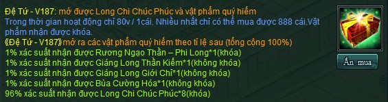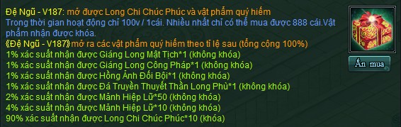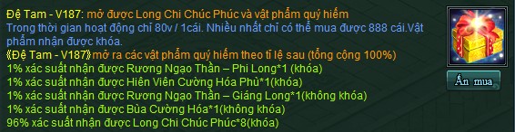 - Trong sự kiện V187, tạm đóng hoạt động " tích lũy " khi mua vật phẩm trong Long Chi Chúc Phúc